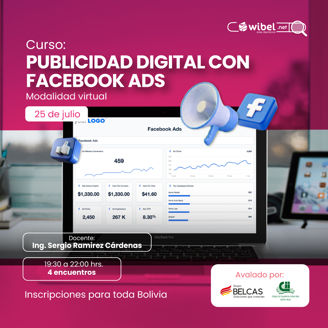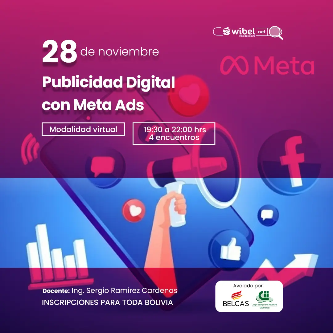 El curso busca desarrollar competencias prácticas y estratégicas para gestionar campañas publicitarias en el ecosistema de Meta Ads, desde sus fundamentos hasta la optimización avanzada. Está dirigido a emprendedores, profesionales del marketing y personas interesadas en la publicidad digital en Bolivia. Al finalizar, los participantes estarán capacitados para crear campañas efectivas, aplicar retargeting y utilizar herramientas actuales para mejorar el retorno de inversión y alcanzar objetivos comerciales en plataformas como Facebook e Instagram.